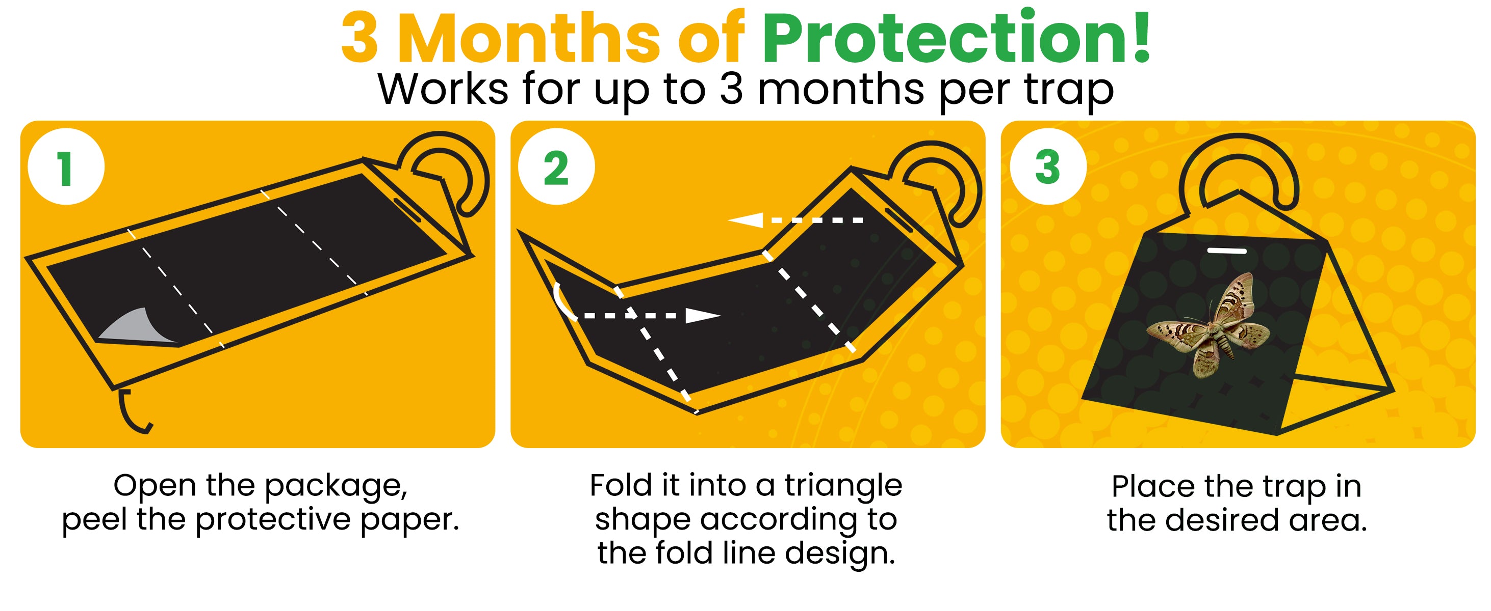 • Adhesivo de resistencia industrial: es extremadamente pegajoso, por lo que las polillas nunca pueden escapar, lo que permite una reducción a largo plazo de las poblaciones de polillas y proporciona una solución segura y a largo plazo.